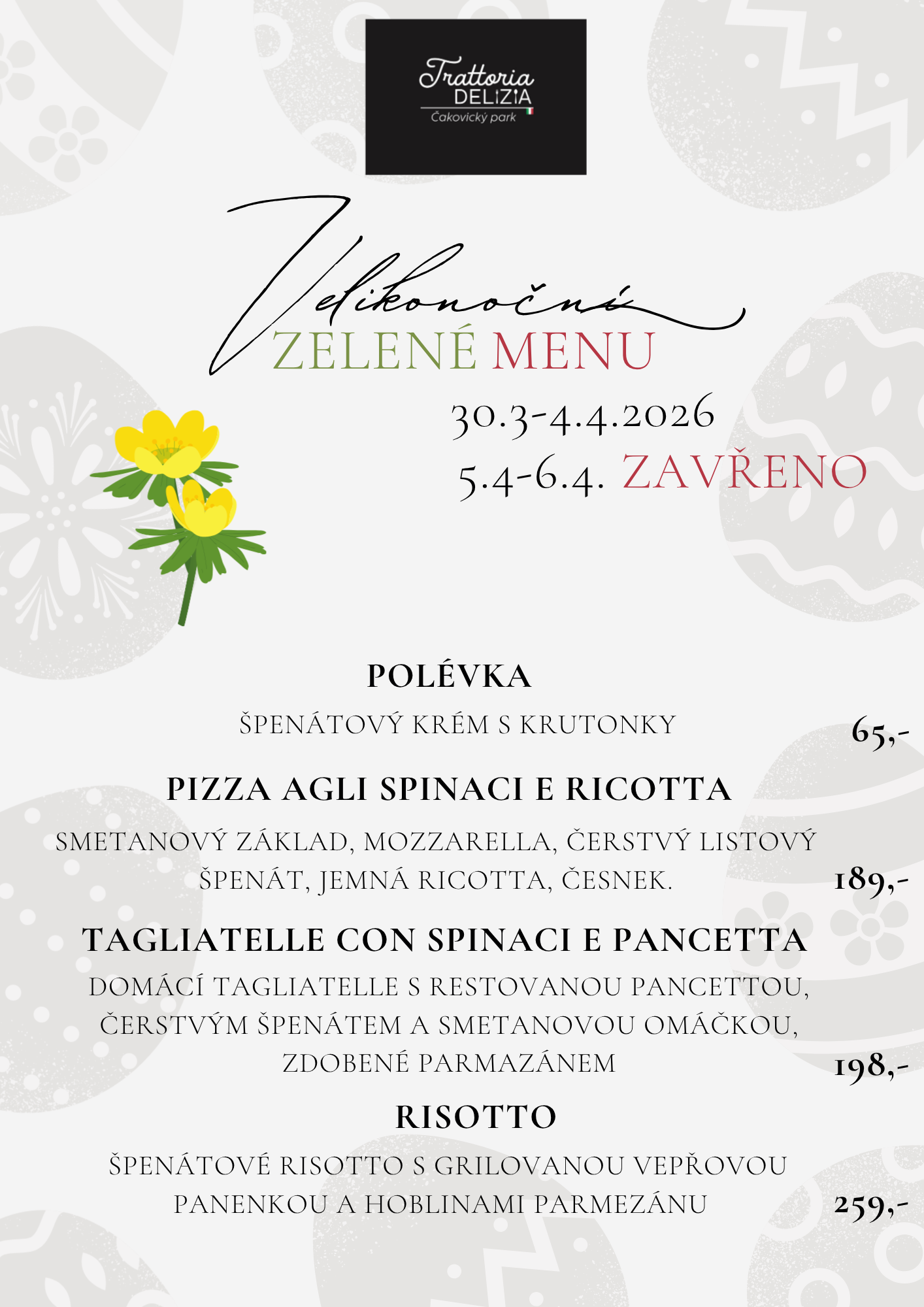 | Pollo e Spinaci (smetanová omáčka, mozzarella, kuřecí maso, špenát, česnek) |